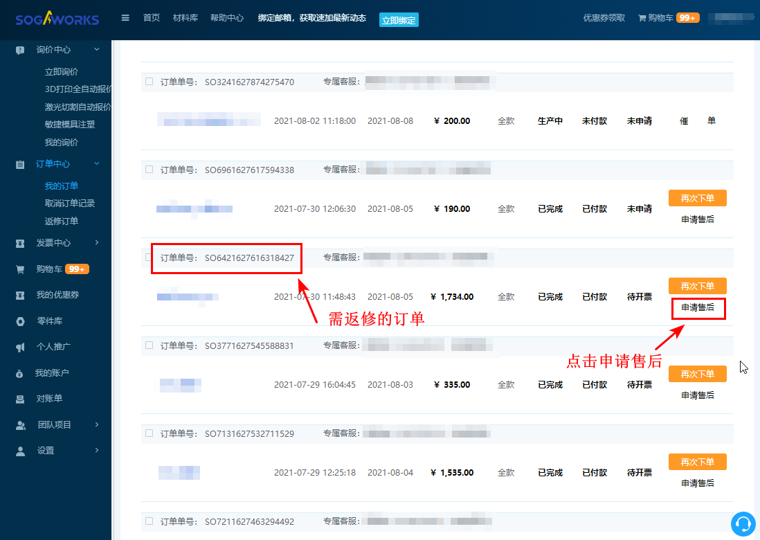 (3)找到需進行返修的訂單,點擊【申請售后】