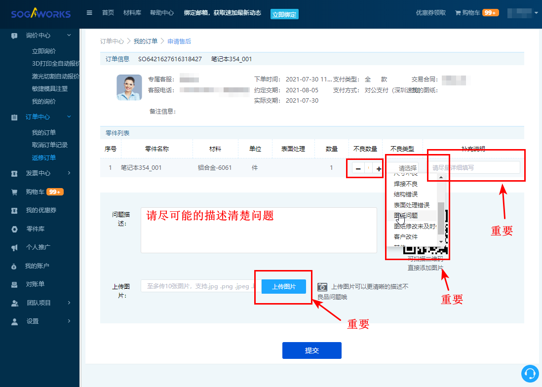 質(zhì)量問題類型具體描述反饋時效返修費用往返郵費